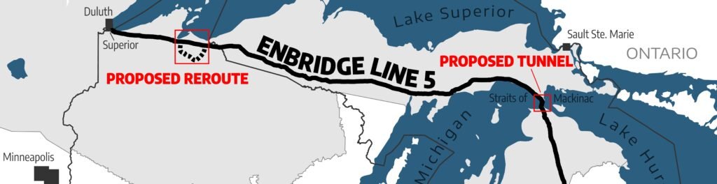 Here you can find an interactive map of the proposed Line 5 re-route in Wisconsin, as well as a map of its path under the Mackinac Straits in Michigan. The map can be used on your desktop and phone, and is sourced from public documents compiled through the Environmental Impact Statement regulatory process.