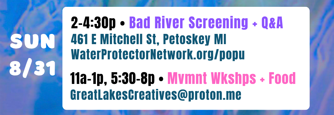Water Weekend events on Sunday: Bad River film screening (2-4:30pm) and Movement workshops (10am-1pm and 5:30-8pm)